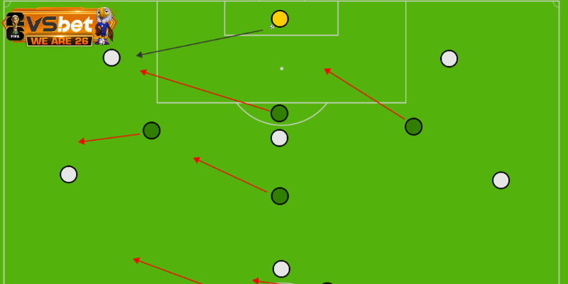 Thay vì lùi sâu, toàn đội hình sẽ dâng cao như một khối thống nhất nhằm bóp nghẹt không gian của đối thủ. Sự đồng bộ trong di chuyển giúp chiến thuật pressing hoạt động trơn tru, khiến hàng thủ đối phương dễ dàng mắc những sai lầm nguy hiểm ngay phần sân nhà.